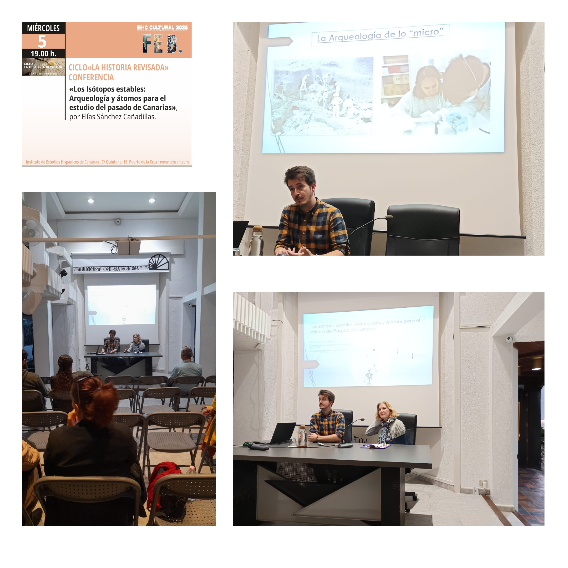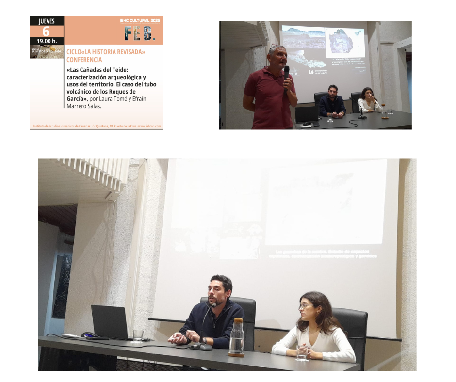 Ciclo «La Historia Revisada», coorganizado con el Instituto de Estudios Canarios de la Laguna. 1ª Conferencia «Los Isótopos estables: Arqueología y átomos para el estudio del pasado de Canarias», por Elías Sánchez Cañadillas. Conferencia «Las Cañadas del Teide: caracterización arqueológica y usos del territorio. El caso del tubo volcánico de los Roques de García», por Laura Tomé y Efraín Marrero Salas.