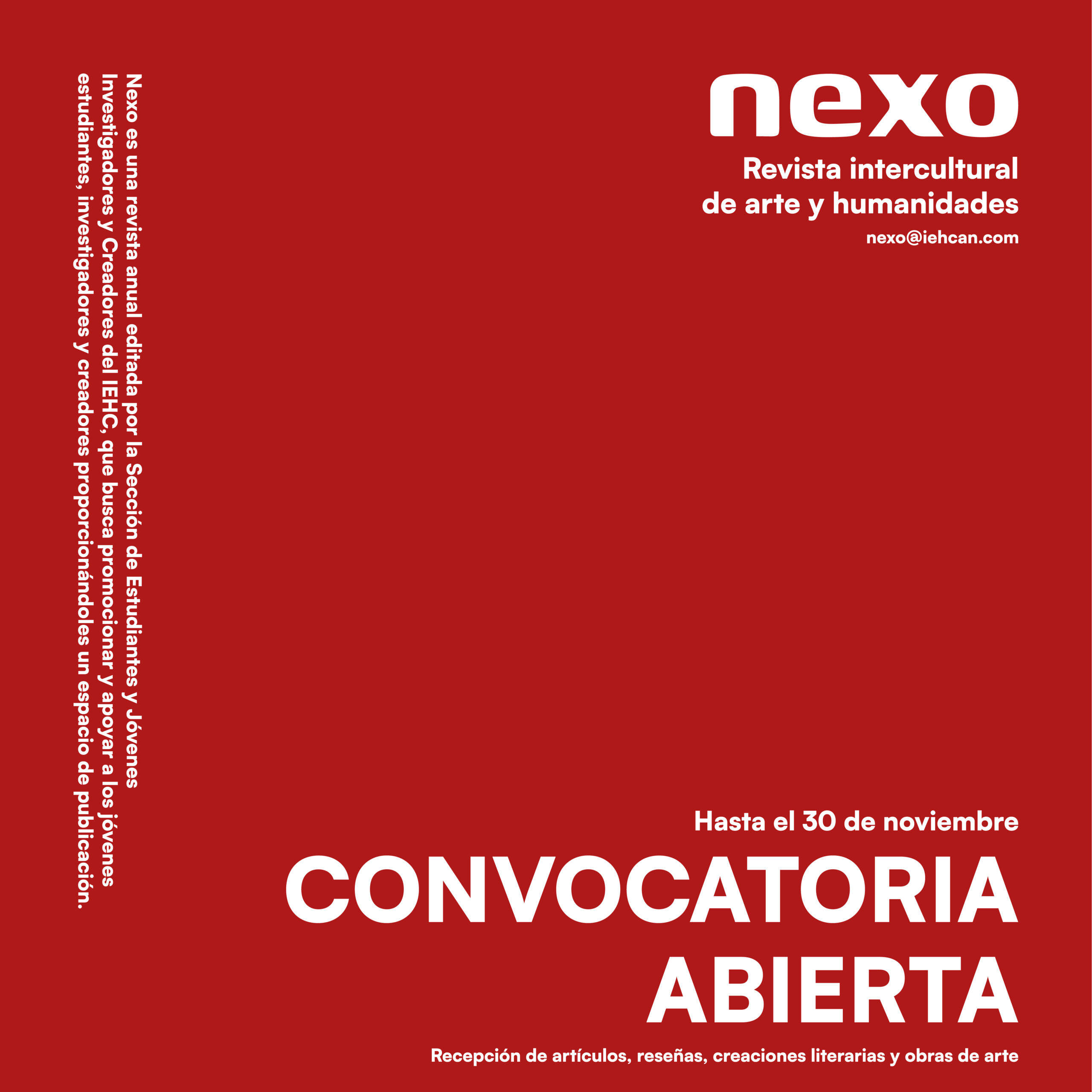 Nos complace anunciar que la convocatoria para el próximo número de la revista nexo está oficialmente abierta . Si eres estudiante o joven investigadorx o creadorx menor de 35 años, este es tu espacio. nexo es la revista intercultural de arte y humanidades editada por la Sección de Estudiantes del IEHCAN. Nuestro objetivo es promover a las personas interesadas en publicar y apoyar el talento emergente ofreciendo una plataforma de publicación anual donde dar a conocer su trabajo.